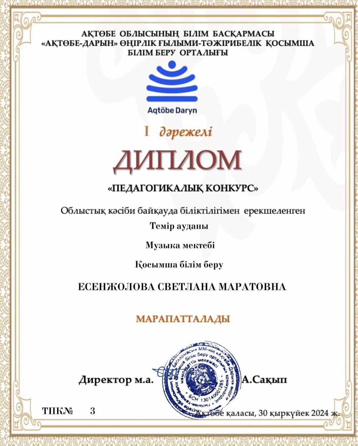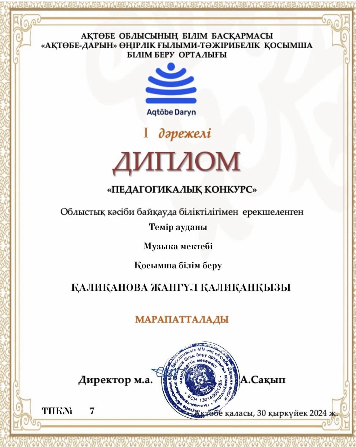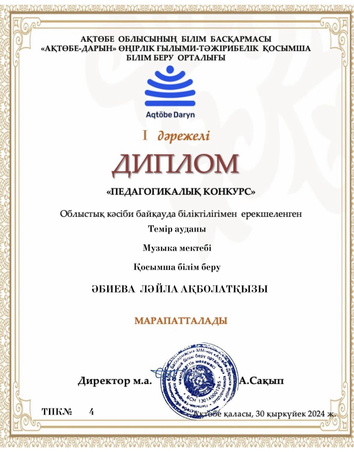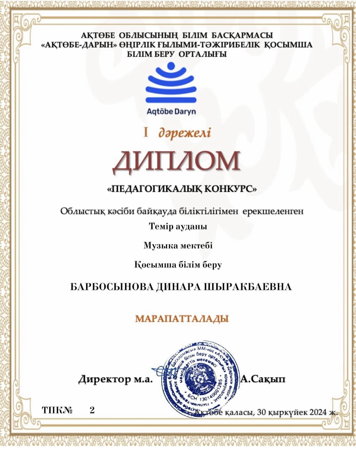 АҚТӨБЕ ОБЛЫСЫНЫҢ БІЛІМ БАСҚАРМАСЫ «АҚТӨБЕ — ДАРЫН» ӨҢІРЛІК ҒЫЛЫМИ — ТӘЖІРИБЕЛІК ҚОСЫМША БІЛІМ БЕРУ ОРТАЛЫҒЫ ұйымдастырған «Педагогикалық конкурс» Облыстық кәсіби байқауында біліктілігімен ерекшеленген әріптестеріміз жүлделі І — ІІ орындарды иеленді.