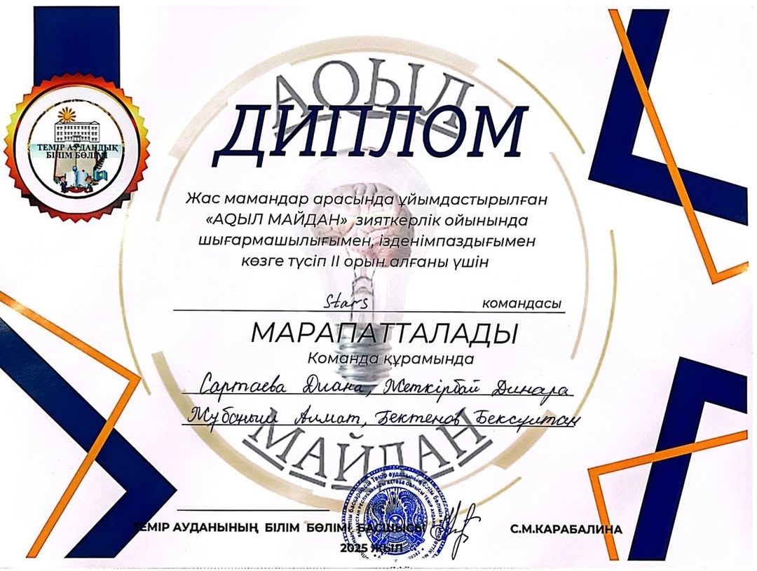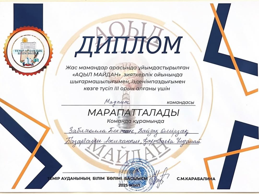 №2 Шұбарқұдық қазақ-орыс жалпы орта білім беретін мектебінде өткен “AQYL MAIDAN” атты жас мамандарға арналған зияткерлік ойынына мектебіміздің атынан Бектенов Бексұлтан Ізмұратұлы мен Қартбаева Ұлданай Мерхатқызы қатысып жүлделі орындармен марапатталды.