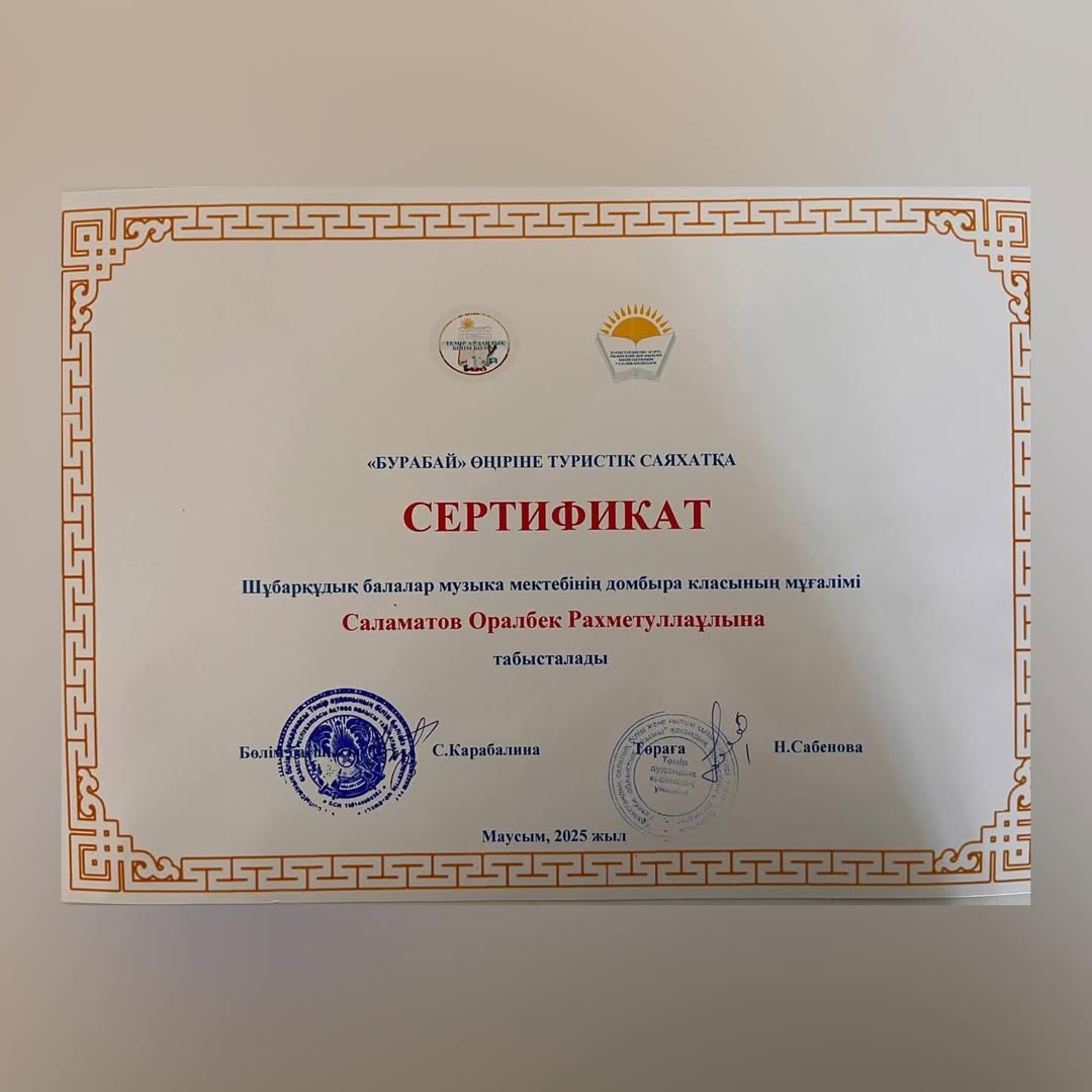 Бәсекеге қабілетті жеке тұлғаны тәрбиелеу мен сапалы білім беру ісіндегі табысты ұстаздық еңбегі үшін Темір аудандық білім беру бөлімінің басшысы С.Карабалина мен Темір аудандық кәсіподақ ұйымының төрайымы Н. Сабенованың Алғыс хатымен және “Бурабай” өңіріне туристтік саяхатқа Сертификатпен мектебіміздің домбыра класының мұғалімі Саламатов Оралбек Рахметоллаұлы марапатталды.