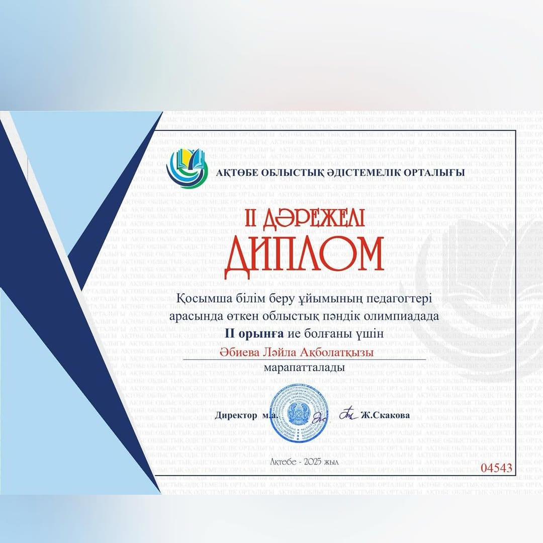 Ақтөбе облыстық әдістемелік орталығы ұйымдастырған Қосымша білім беру ұйымының педагогтері арасында өткен облыстық пәндік олимпиадада мектебіміздің баян класының мұғалімі Әбиева Ләйла Ақболатқызы ІІ дәрежелі Дипломмен марапатталды