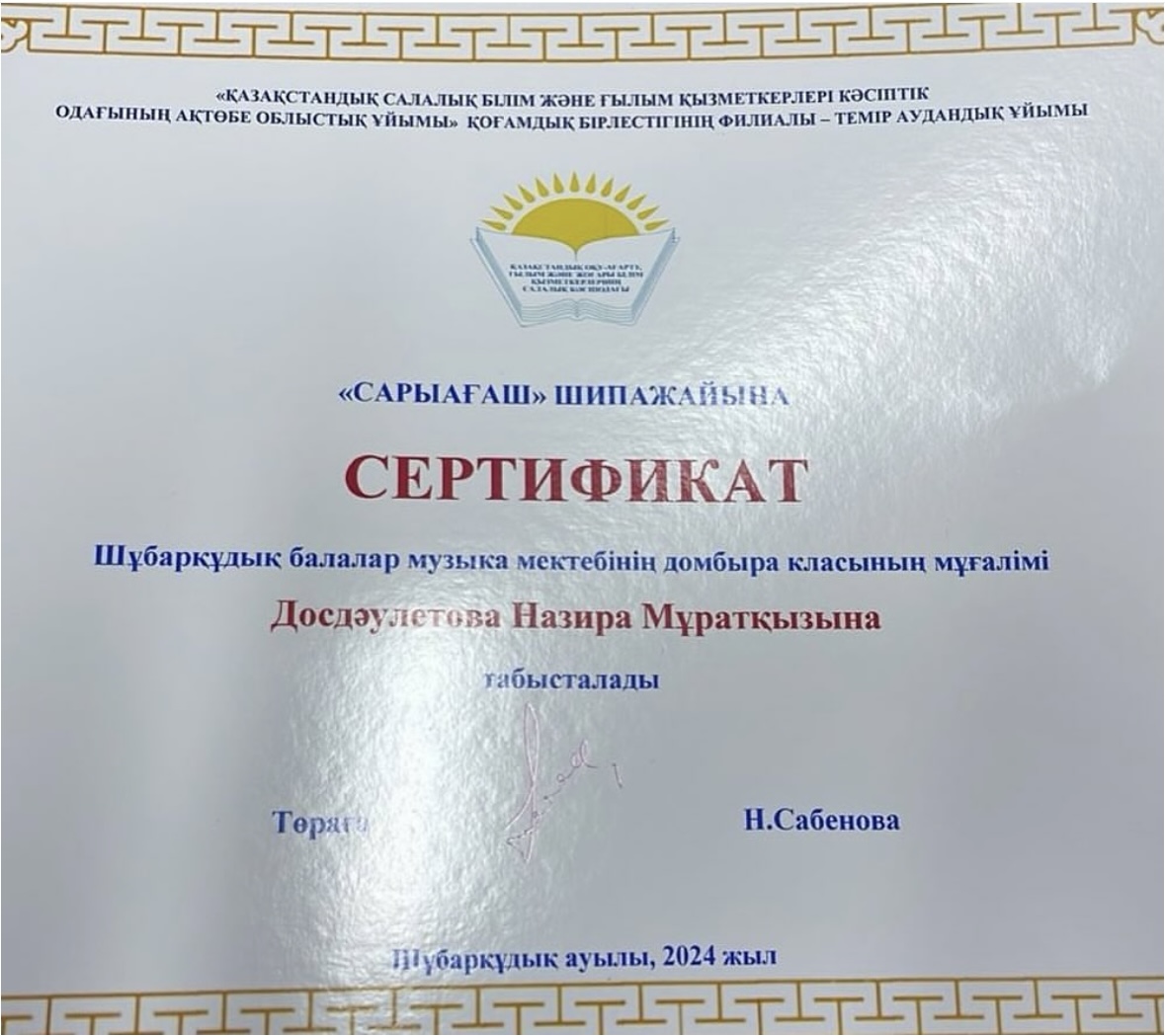 «Қазақстандық салалық білім және ғылым қызметкерлері кәсіптік одағының Ақтөбе облыстық ұйымы» қоғамдық бірлестігінің филиалы - Темір аудандық ұйымының төрайымы Н.Ж. Сабенова мен Темір ауданының білім бөлімінің басшысы С.М. Карабалина атынан Алғыс хатпен және Сарыағаш шипажайына сертификатпен мектебіміздің домбыра класының мұғалімі Досдаулетова Назира Мұратқызы марапатталды.
