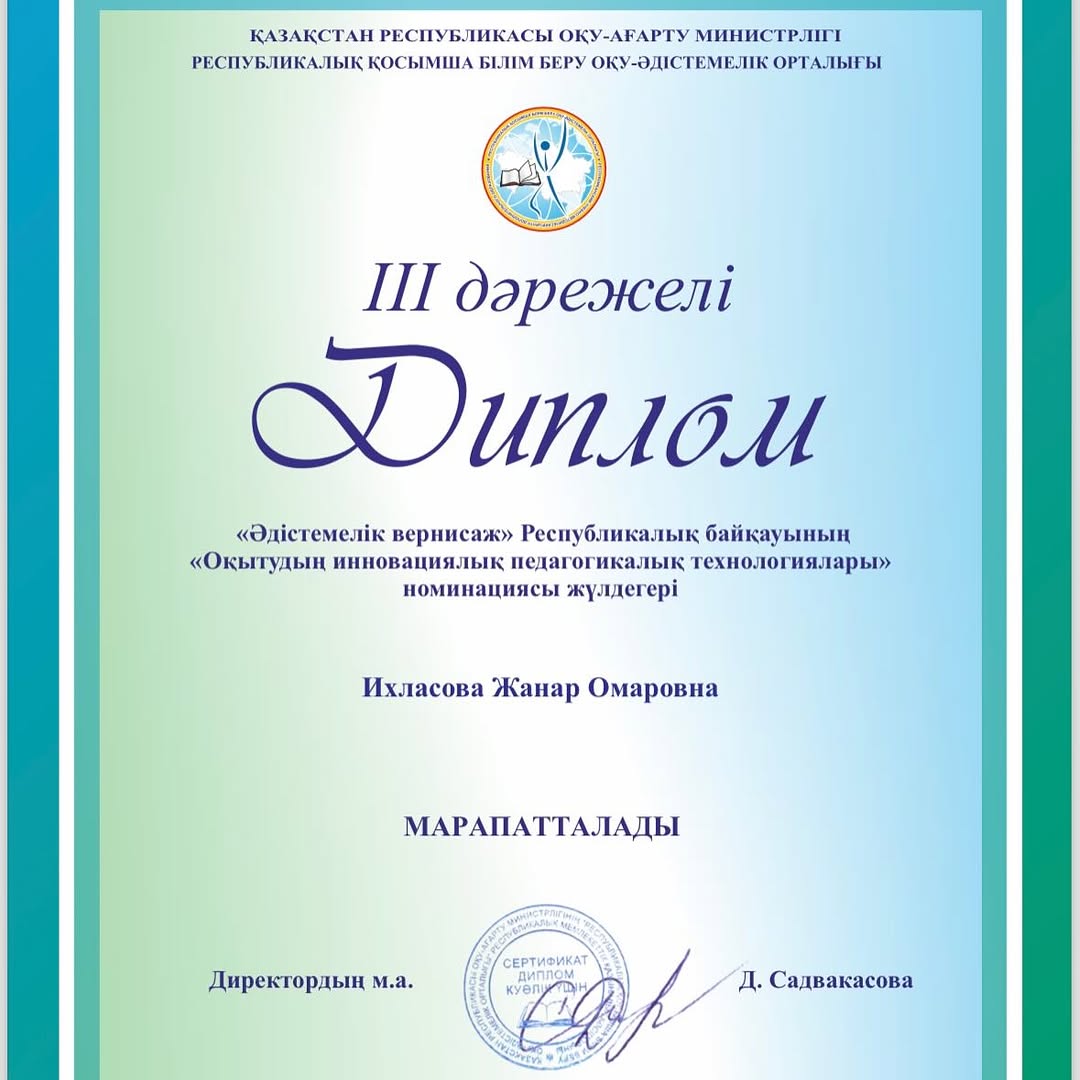 Қазақстан Республикасы оқу-ағарту министрлігі мен Республикалық қосымша білім беру оқу-әдістемелік орталығы ұйымдастыруымен “Әдістемелік Вернисаж” Республикалық байқауының “Оқытудың инновациялық педагогикалық технологиялары” номинациясы бойынша мектебіміздің оқу-ісі жөніндегі орынбасы Ихласова Жанар Омаровна ІІІ дәрежелі Дипломмен марапатталды.