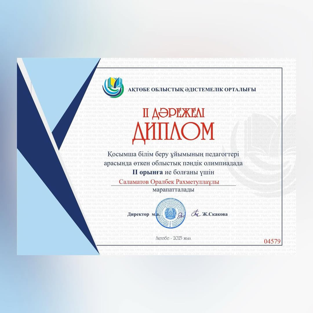 АҚТӨБЕ ОБЛЫСТЫҚ ӘДІСТЕМЕЛІК ОРТАЛЫҒЫ ұйымдастырған Қосымша білім беру ұйымының педагогтері арасында өткен облыстық пәндік олимпиадада мектебіміздің домбыра класының мұғалімі Саламатов Оралбек Рахметоллаұлы ІІ дәрежелі Дипломмен марапатталды.