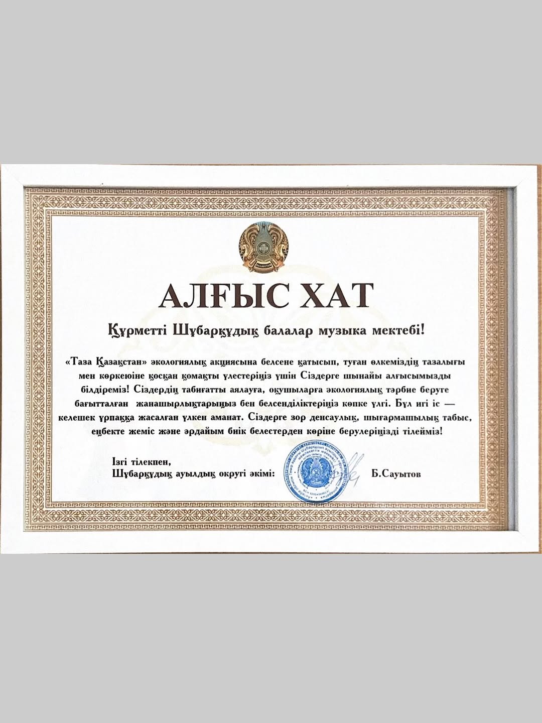 “Таза Қазақстан” экологиялық акциясына белсене қатысып, туған өлкеміздің тазалығы мен көркеюіне қосқан қомақты үлестеріңіз үшін Сіздерге шынайы алғысымызды білдіреміз! Сіздердің табиғатты аялауға, оқушыларға экологиялық тәрбие беруге бағытталған жанашырлықтарыңыз бен белсенділіктеріңіз көпке үлгі. Бұл игі іс - келешек ұрпаққа жасалған үлкен аманат. Сіздерге зор денсаулық, шығармашылық табыс, еңбекте жеміс және әрдайым биік белестерден көріне берулеріңізді тілейміз!