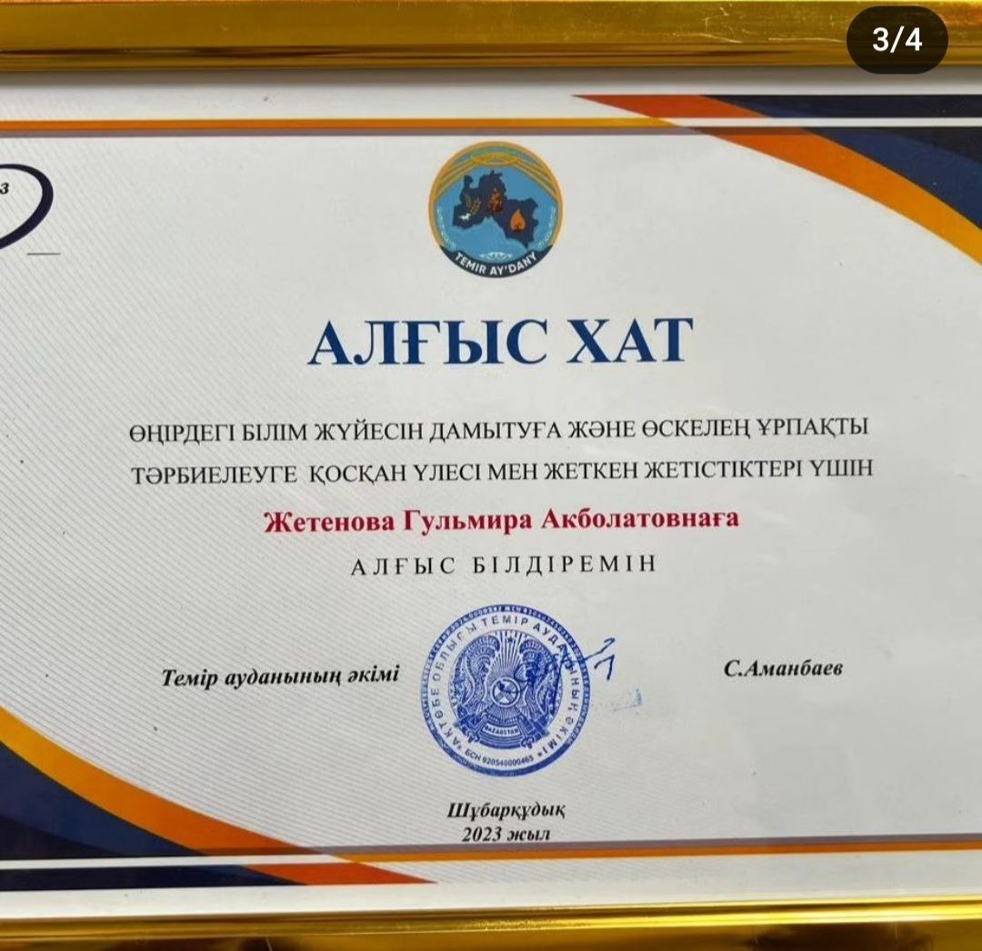 Өңірдегі білім жүйесін дамытуға және өскелең ұрпақты тәрбиелеуге қосқан үлесі мен жеткен жетістіктері үшін баян класының мұғалімі Жетенова Гүлмира Ақболатқызы Темір ауданының әкімі Аманбаев Саламат Ермұханұлының «АЛҒЫС ХАТЫМЕН» марапатталды.