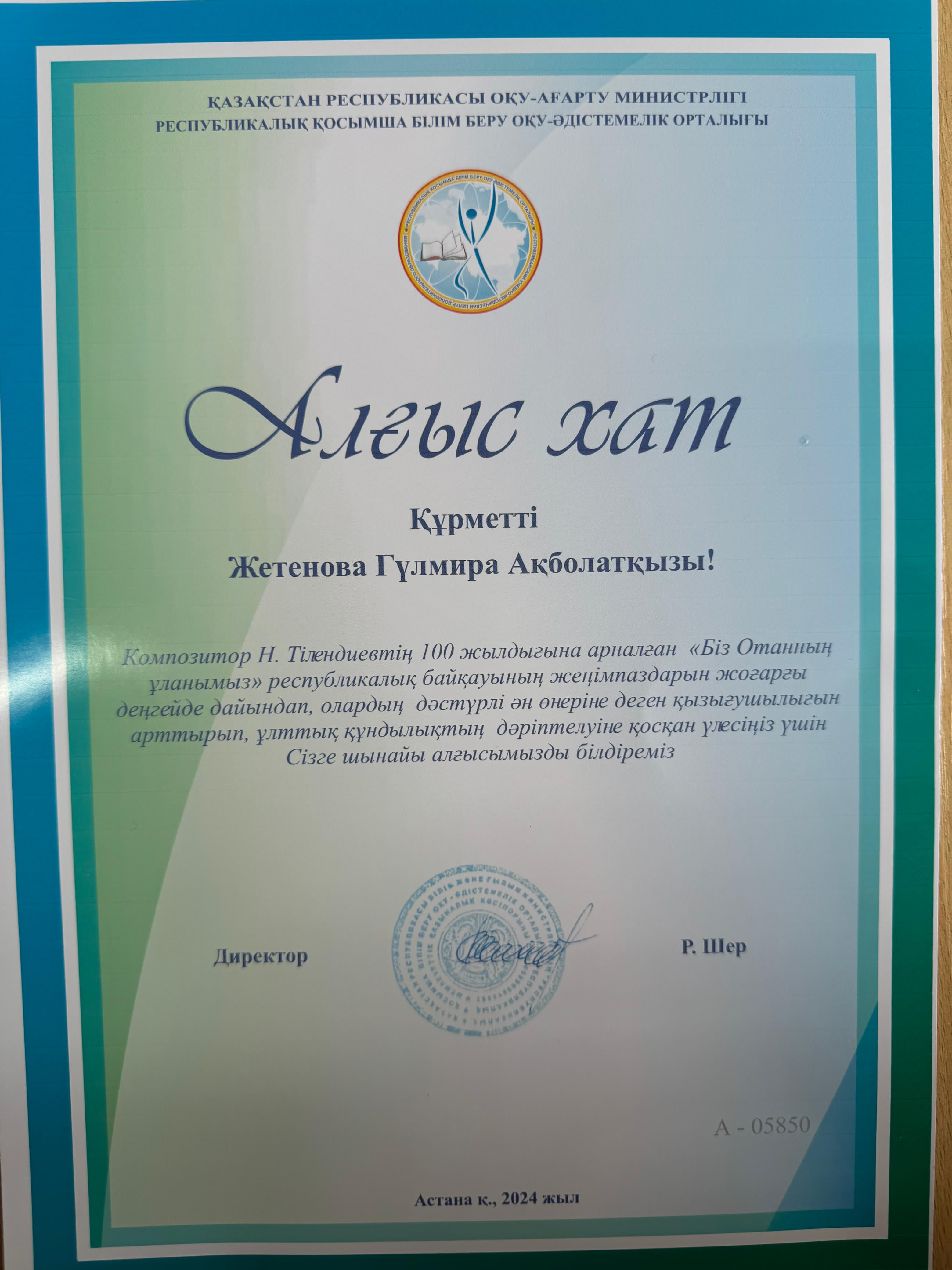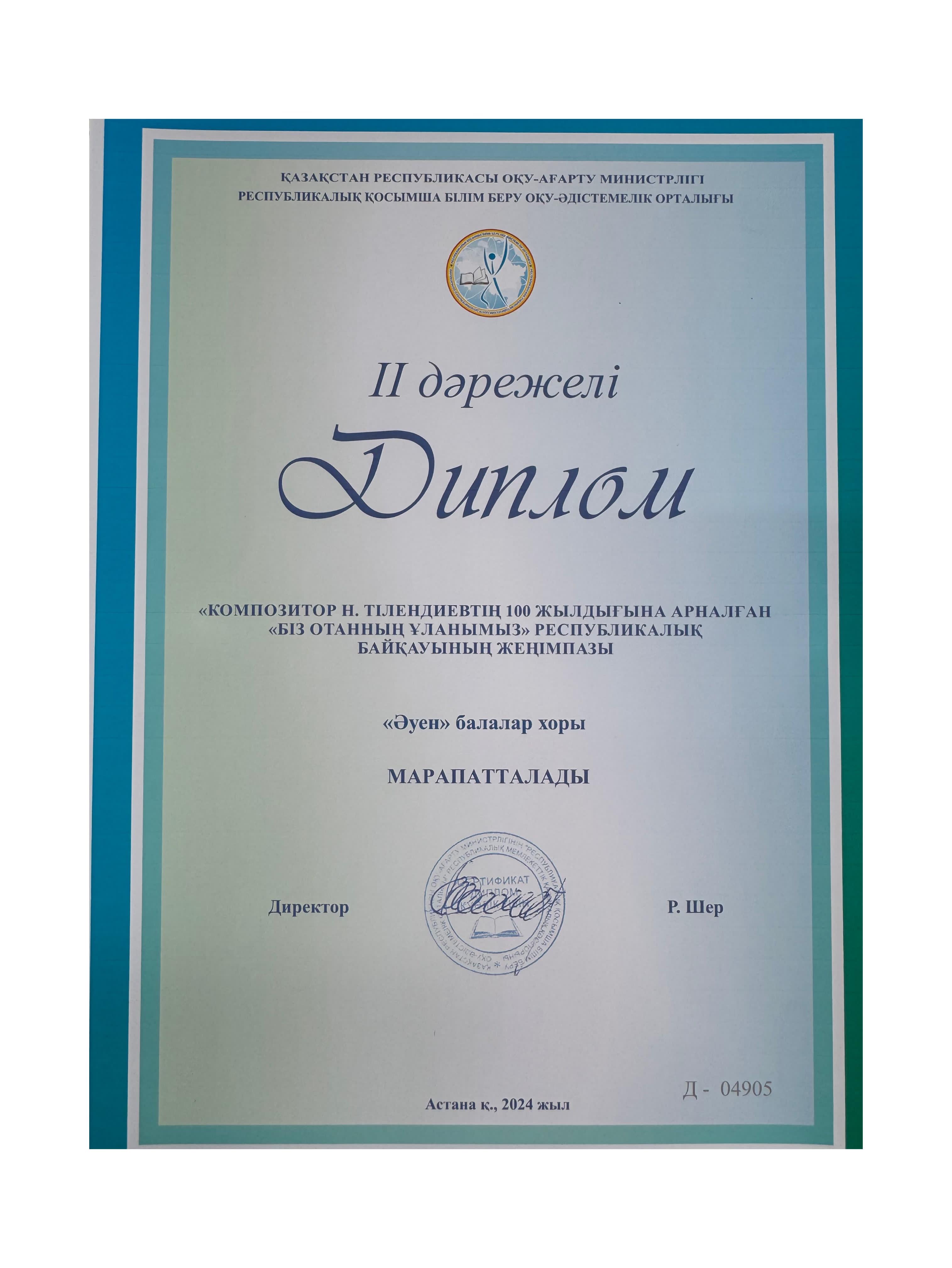 Композитор Н.Тілендиевтің 100 жылдығына арналған «Біз Отанның ұланымыз» Республикалық байқауының жеңімпазы «Әуен» балалар хоры ІІ дәрежелі Дипломмен марапатталды. Жетекшісі: Жетенова Гүлмира Ақболатқызы