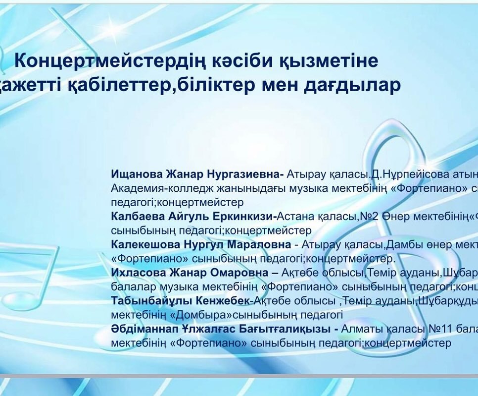 • Фортепиано класының педагогі, концертмейстер Ихласова Жанар Омарқызы мен домбыра класының педагогі Табынбай Кенжебек, "Концертмейстердің кәсіби қызметіне қажетті қабілеттер, біліктер мен дағдылар" тақырыбында жоба қорғады.