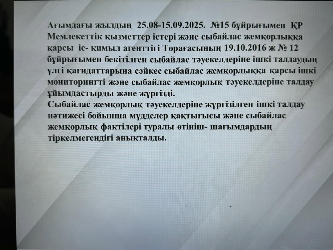 Ағымдағы жылдың 25.08 - 15.09.2025. №15 бұйрығымен ҚР Мемлекеттік қызметтер істері және сыбайлас жемқорлыққа қарсы іс - қимыл агенттігі Төрағасының 19.10.2016 ж №12 бұйрығымен бекітілген сыбайлас тәуекелдеріне ішкі талдаудың үлгі қағидаттарына сәйкес сыбайлас жемқорлыққа қарсы ішкі мониторингті және сыбайлас жемқорлық тәуекелдеріне талдау ұйымдастырды және жүргізді. Сыбайлас жемқорлық тәуекелдеріне жүргізілген ішкі талдау нәтижесі бойынша мүдделер қақтығысы және сыбайлас жемқорлық фактілері туралы өтініш - шағымдардың тіркелмегендігі анықталды.