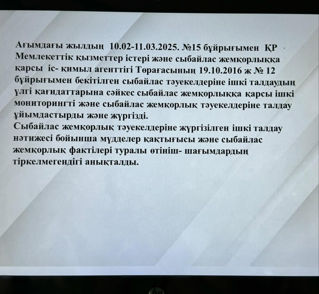 Ағымдағы жылдың 10.02 - 11.03.2025. №15 бұйрығымен ҚР Мемлекеттік қызметтер істері және сыбайлас жемқорлыққа қарсы іс - қимыл агенттігі Төрағасының 19.10.2016 ж № 12 бұйрығымен бекітілген сыбайлас тәуекелдеріне ішкі талдаудың үлгі қағидаттарына сәйкес сыбайлас жемқорлыққа қарсы ішкі мониторингті және сыбайлас жемқорлық тәуекелдеріне талдау ұйымдастырды және жүргізді. Сыбайлас жемқорлық тәуекелдеріне жүргізілген ішкі талдау нәтижесі бойынша мүдделер қақтығысы және сыбайлас жемқорлық фактілері туралы өтініш - шағымдардың тіркелмегендігі анықталды.