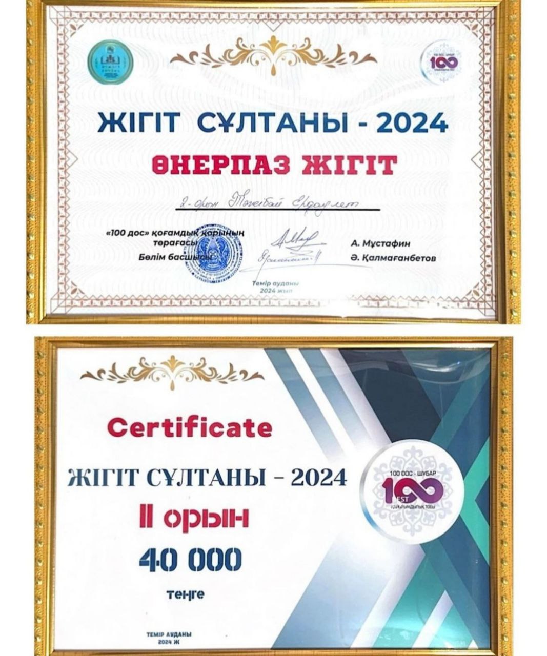 Темір аудандық мәдениет, дене шынықтыру және спорт бөлімімен «100DOC-Шұбар» қоғамдық қорының демеушілігімен ұйымдастырылған «Жігіт сұлтаны-2024» байқауында мектебіміздің домбыра класының мұғалімі Тәжібай Ердаулет Нұрмұқанұлы «Өнерпаз жігіт» номинациясымен жүлделі ІІ орын және 40.000 теңгелік сертификатқа ие болды.