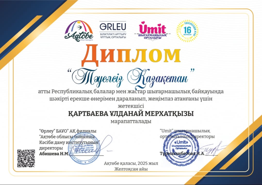 “Umit” шығармашылық орталығының ұйымдастыруымен өткен “Тәуелсіз Қазақстан” Республикалық балалар мен жастар шығармашылық байқауына қобыз класының оқушысы Асанғали Фатима қатысып жүлделі ll-дәрежелі дипломмен марапатталды.