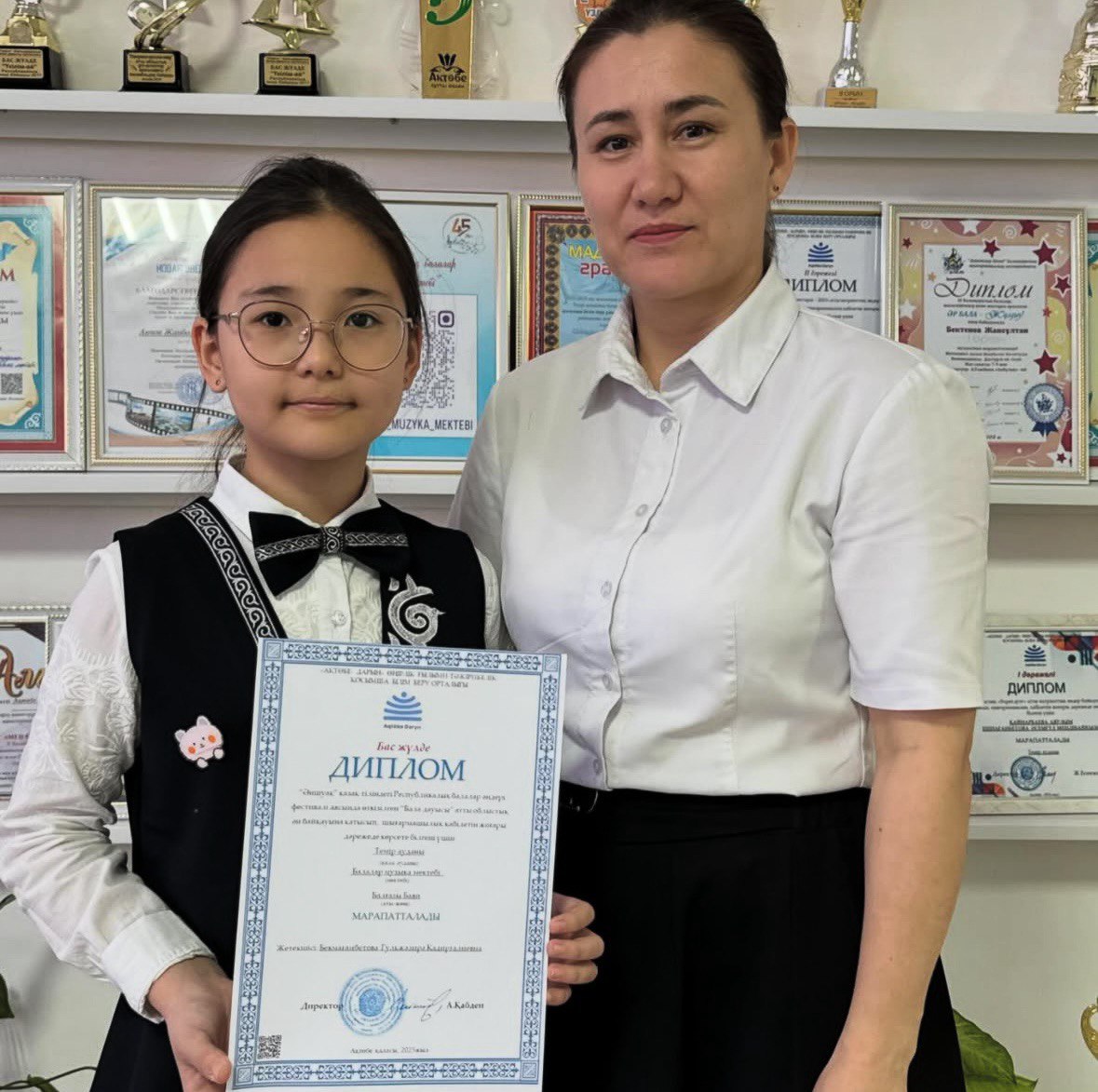 «Ақтөбе - дарын» өңірлік ғылыми тәжірибелік қосымша білім беру орталығы ұйымдастыруымен «Әншуақ» қазақ тіліндегі Республикалық балалар әндері фестивалі аясында өткізілген «Бала дауысы» атты облыстық ән байқауына қатысып, «Академиялық ән» номинациясы бойынша (орта топ 9 - 12 жас) Балғазы Баян Бас жүлде дипломмен марапатталды.