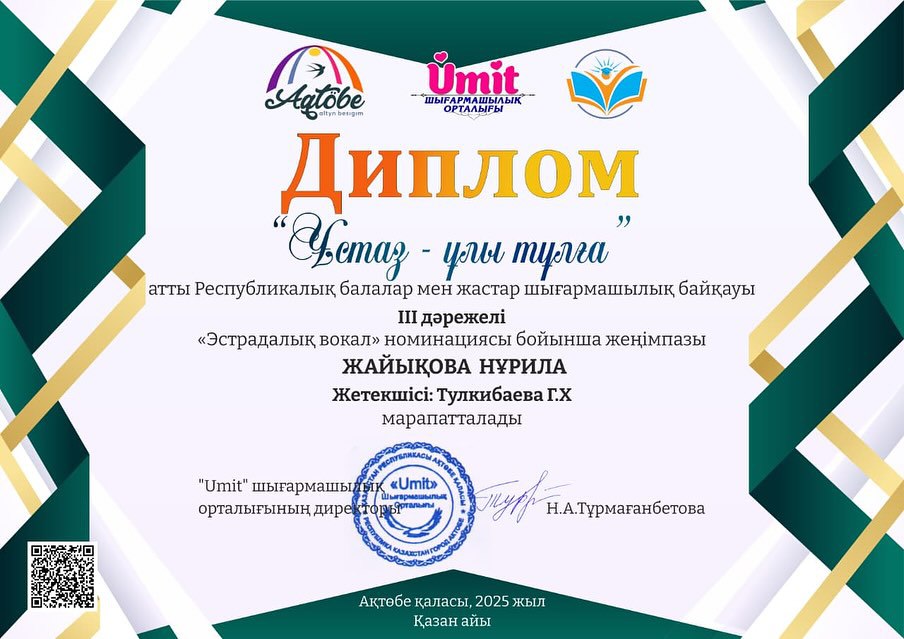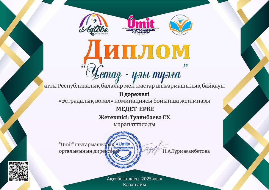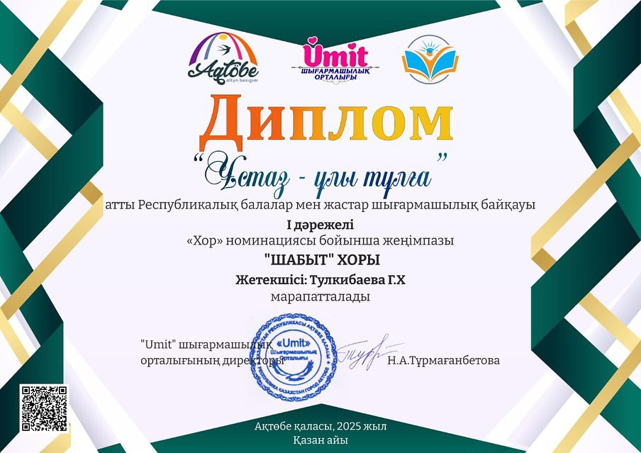 "Хор" номинациясы бойынша "ШАБЫТ" балалар хоры I - дәрежелі дипломмен, "Эстрадалық вокал" номинациясы бойынша Жайықова Нұрила III - дәрежелі дипломмен, Медет Ерке II - дәрежелі дипломмен марапатталды. Жетекшісі Г.Х.Тулкибаева өнерлі оқушыларды дайындап, шығармашылықтарын шыңдап жүргені үшін дипломмен марапатталды