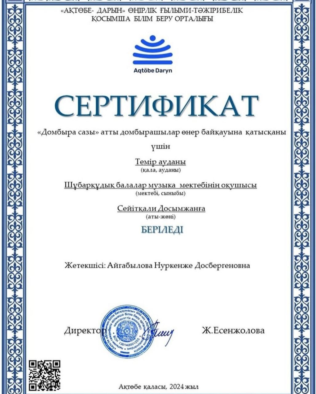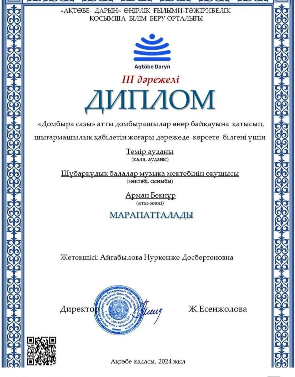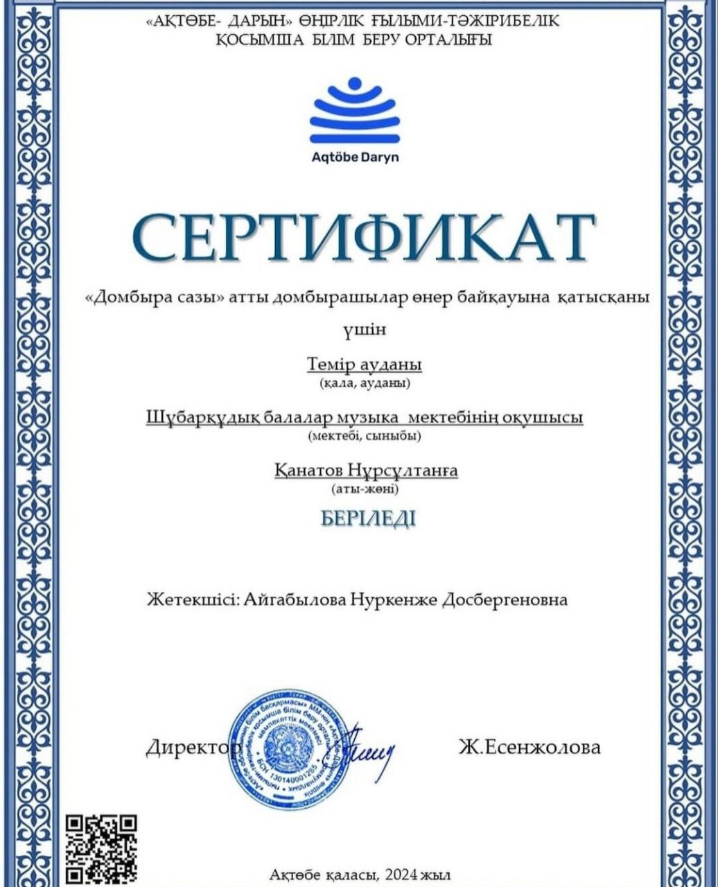 «Ақтөбе-Дарын» өңірлік ғылыми-тәжірибелік қосымша білім беру орталығының ұйымдастыруымен өткен «Домбыра сазы» атты домбырашылар өнер байқауына қатысып, шығармашылық қабілетін жоғары дәрежеде көрсете білгені үшін