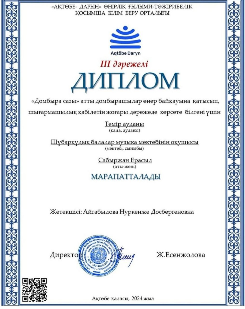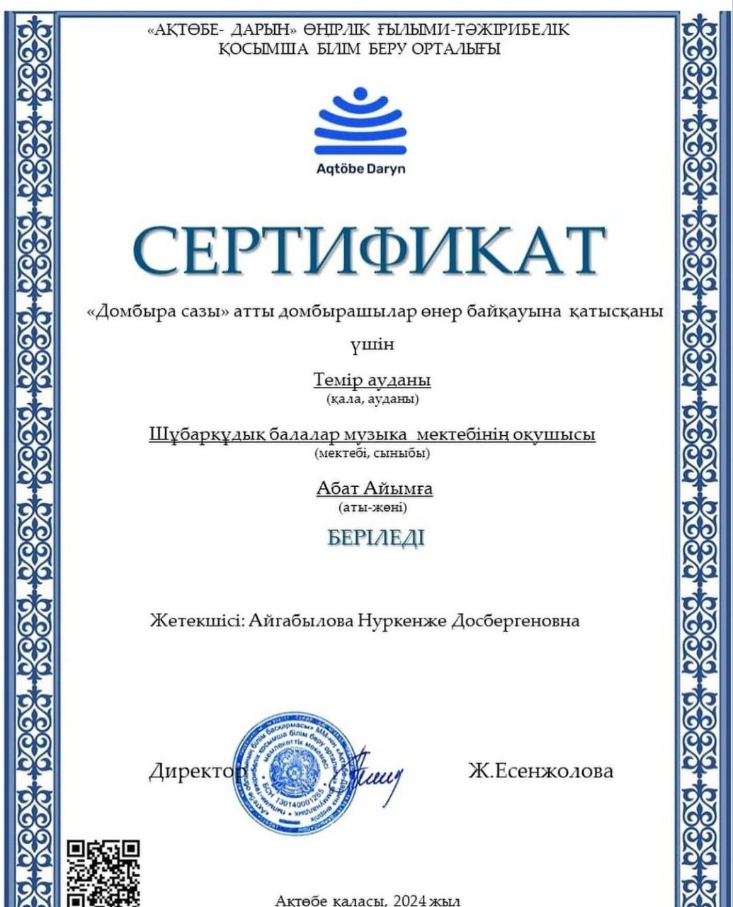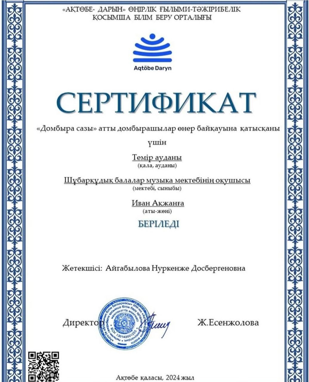«Ақтөбе-Дарын» өңірлік ғылыми-тәжірибелік қосымша білім беру орталығының ұйымдастыруымен өткен «Домбыра сазы» атты домбырашылар өнер байқауына қатысып, шығармашылық қабілетін жоғары дәрежеде көрсете білгені үшін
