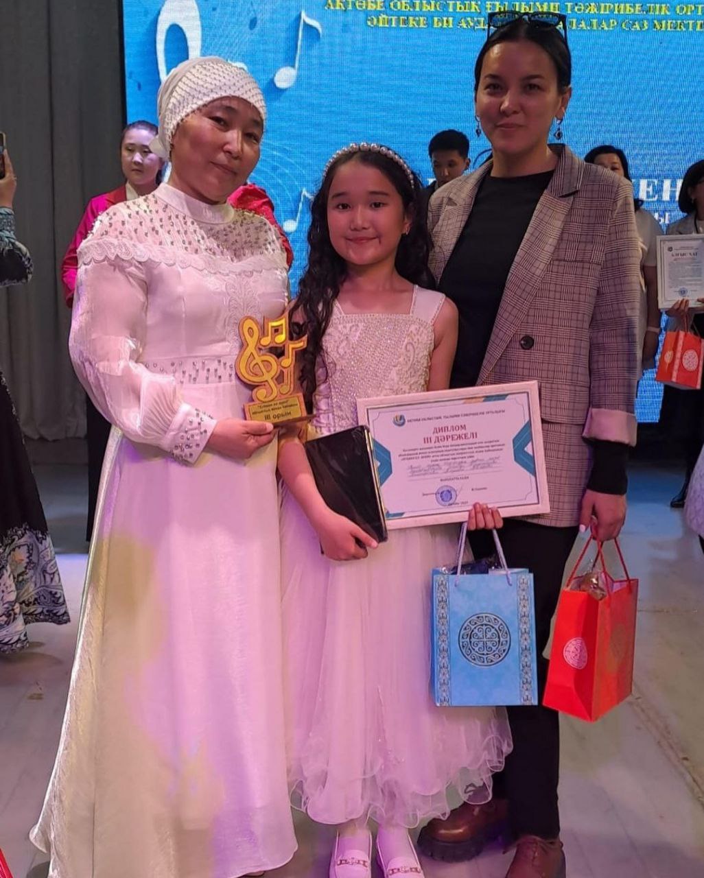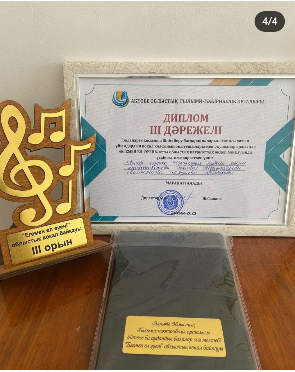 Ақтөбе облыстық ғылыми-тәжірибелік орталығының ұйымдастыруымен өткен балаларға қосымша білім беру бағдарламаларын іске асыратын ұйымдардың вокал класының оқытушылары мен оқушылар арасында «ЕГЕМЕН ЕЛ ӘУЕНІ» атты облыстық патриоттық әндер байқауында мектебіміздің вокал класының мұғалімі Ешпағанбетова Әсемгүл Меңдібайқызы оқушысы Қайнарбаева Аяулым Асхатқызымен үздік нәтиже көрсетіп, ІІІ ДӘРЕЖЕЛІ ДИПЛОММЕН МАРАПАТТАЛДЫ.