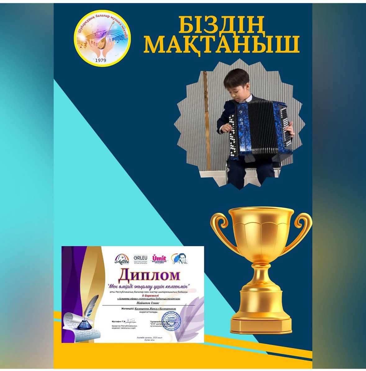 «UMIT» Шығармашылық орталығы ұйымдастыруымен «Мен өмірді жырлау үшін келгенмін» атты Республикалық балалар мен жастар шығармашылық байқауына қатысып, «Аспапта ойнау» номинациясы бойынша найыпов Ілияс ІІ дәрежелі дипломмен марапатталды.