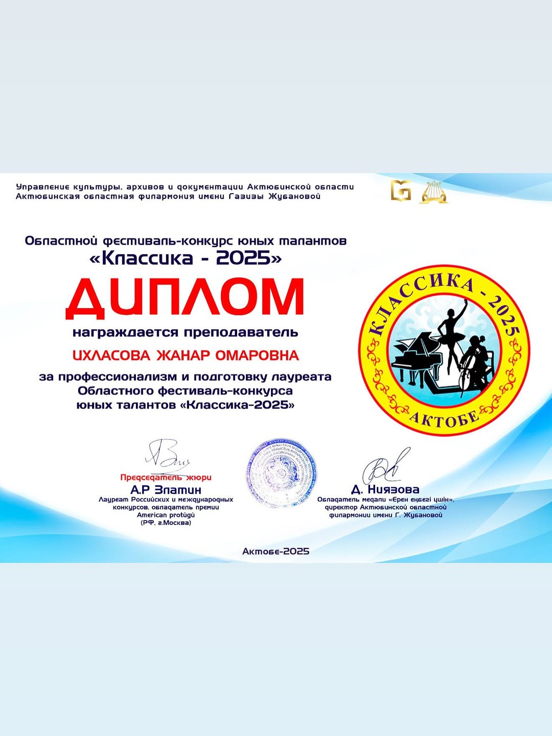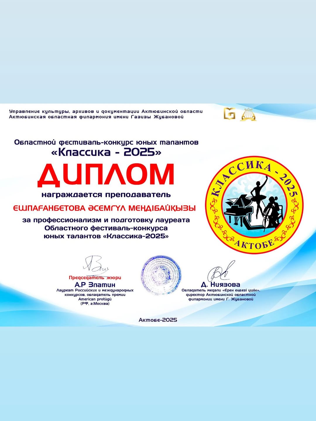 Облыстық “Классика-2025” жас таланттар фестиваль-конкурсының “Академиялық вокал” номинациясы бойынша мектебіміздің вокал класының оқушысы Сергазина Сезім қатысып, дипломмен марапатталды.