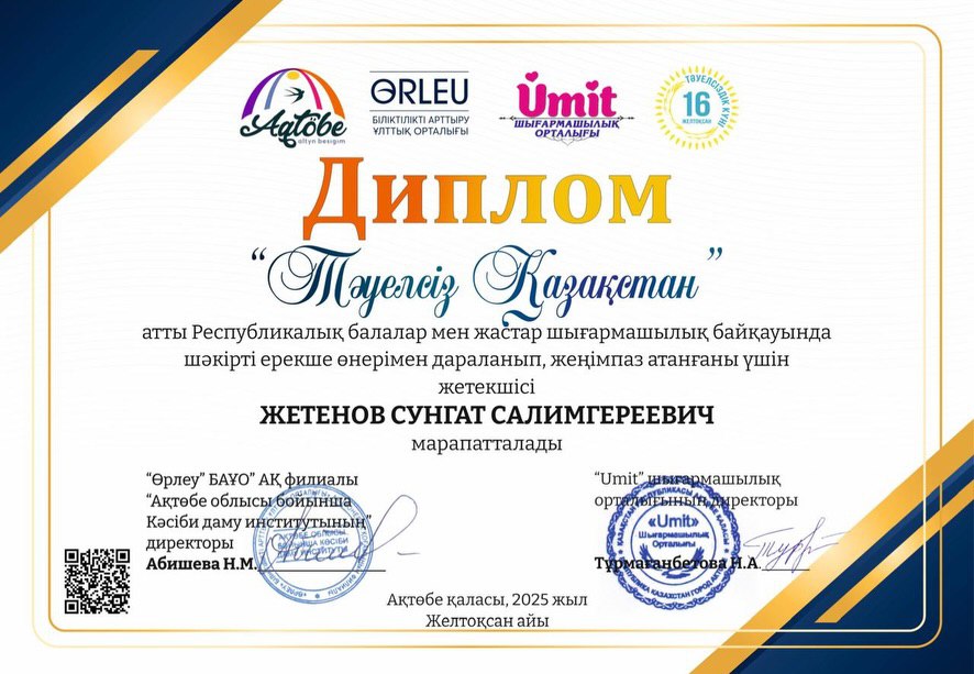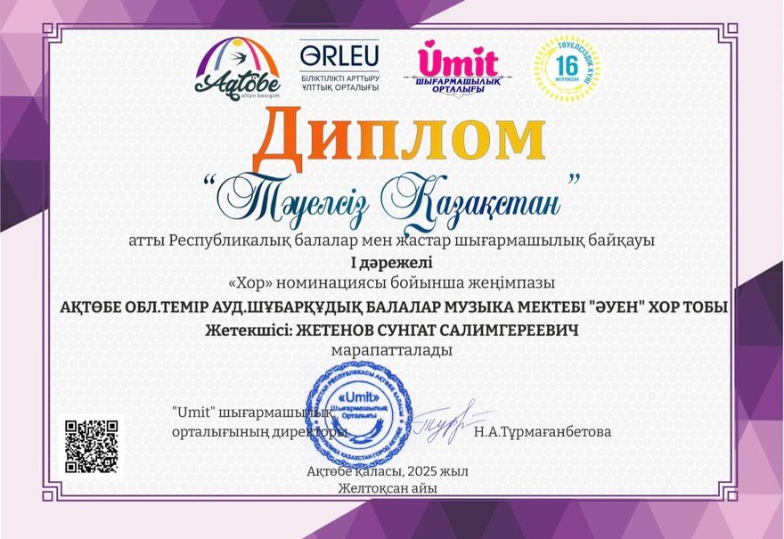 “Umit” шығармашылық орталығының ұйымдастыруымен өткен “Тәуелсіз Қазақстан” Республикалық балалар мен жастар шығармашылық байқауына “Әуен” балалар хоры қатысып l-дәрежелі дипломмен марапатталды. Жетекшісі: Жетенов Сұңғат.