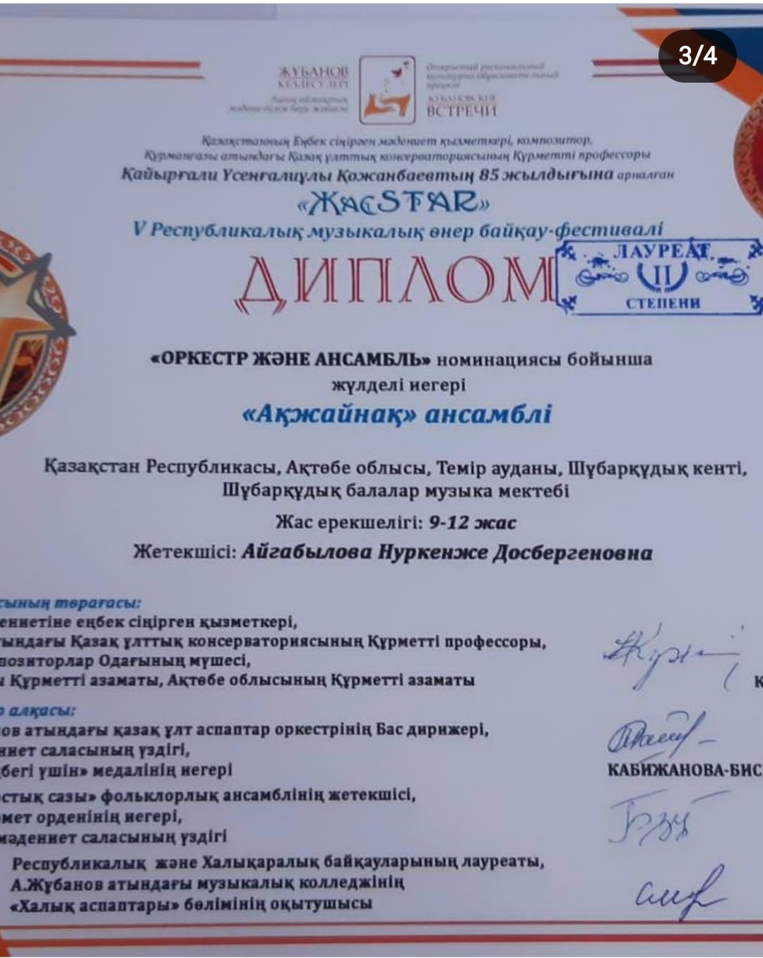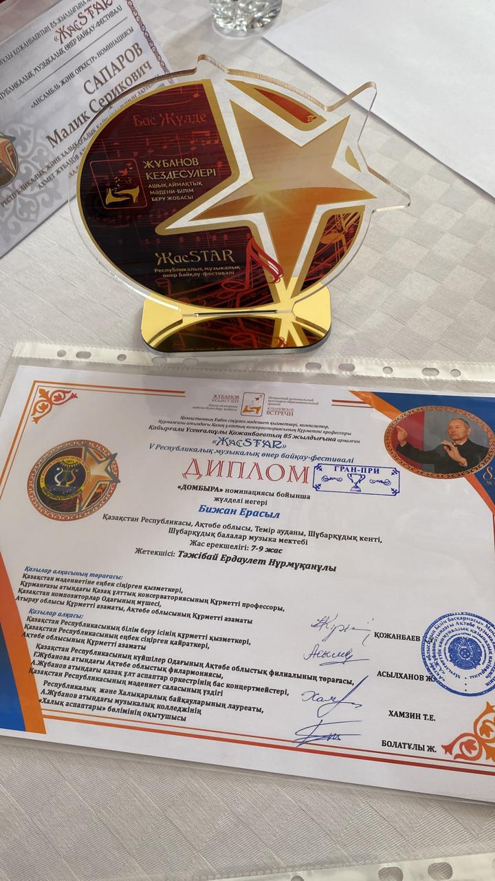 «Жасstar» V Республикалық музыкалық өнер байқау — фестивалінде «Домбыра» номинациясы бойынша Сабыржан Ерасыл ІІ ДӘРЕЖЕЛІ ДИПЛОММЕН, Иван Ақжан ІІІ ДӘРЕЖЕЛІ ДИПЛОММЕН, «Оркестр және ансамбль» ноинациясы бойынша «Ақ жайнақ» ансамбль ІІ ДӘРЕЖЕЛІ ДИПЛОММЕН, «Жас өрен» ансамблі ІІІ ДӘРЕЖЕЛІ ДИПЛОММЕН, «Серпін», «Балауса» ансамблі ІІ ДӘРЕЖЕЛІ ДИПЛОММЕН, Бижан Ерасыл ГРАН ПРИМЕН, Қайсар Нұрасыл, Қыдырбай Еркеназ ІІІ ДӘРЕЖЕЛІ ДИПЛОММЕН, Қалдымұрат Мейірлан, Қанатов Нұрбақыт І ДӘРЕЖЕЛІ ДИПЛОММЕН, Кәдірғали Інжу ІІ ДӘРЕЖЕЛІ ДИПЛОММЕН марапатталды. жетекшілері: Әбенова Камила Сәрсенбайқызы, Айғабылова Нұркенже Досбергенқызы, Тәжібай Ердаулет Нұрмұқанұлы